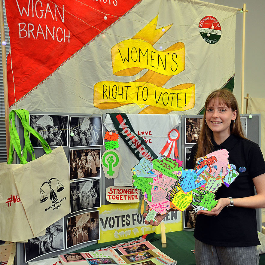 The Game Changer groups recreated the Suffrage Bazaar for a 2019 audience. Each group had their own stalls that showcased all of the work they had made over the course of the project and photographs from the recreation of the suffragist demonstration.