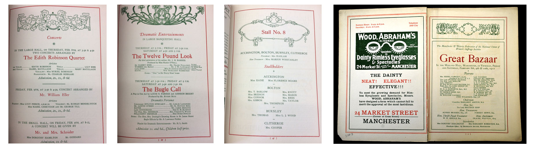 The evidence for the Bazaar and what it consisted of is taken from the Bazaar handbook, Archives+, Manchester Central Library. From it can be seen the different suffrage societies from the Manchester surrounding areas that took part, how the organisation was able to fundraise (e.g. through advertising revenue) and the entertainment of offer.