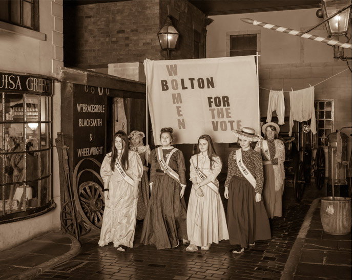 The group recreated the 1908 Manchester Women’s Suffrage Demonstration 1908 by marching down Lark Hill Place (a replica Victorian street at Salford Museum and Art Gallery) in costume wearing their sashes and displaying their banner.