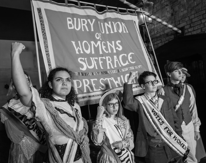 The group recreated the 1908 Manchester Women’s Suffrage Demonstration 1908 by marching down Lark Hill Place (a replica Victorian street at Salford Museum and Art Gallery) in costume wearing their sashes and displaying their banner.