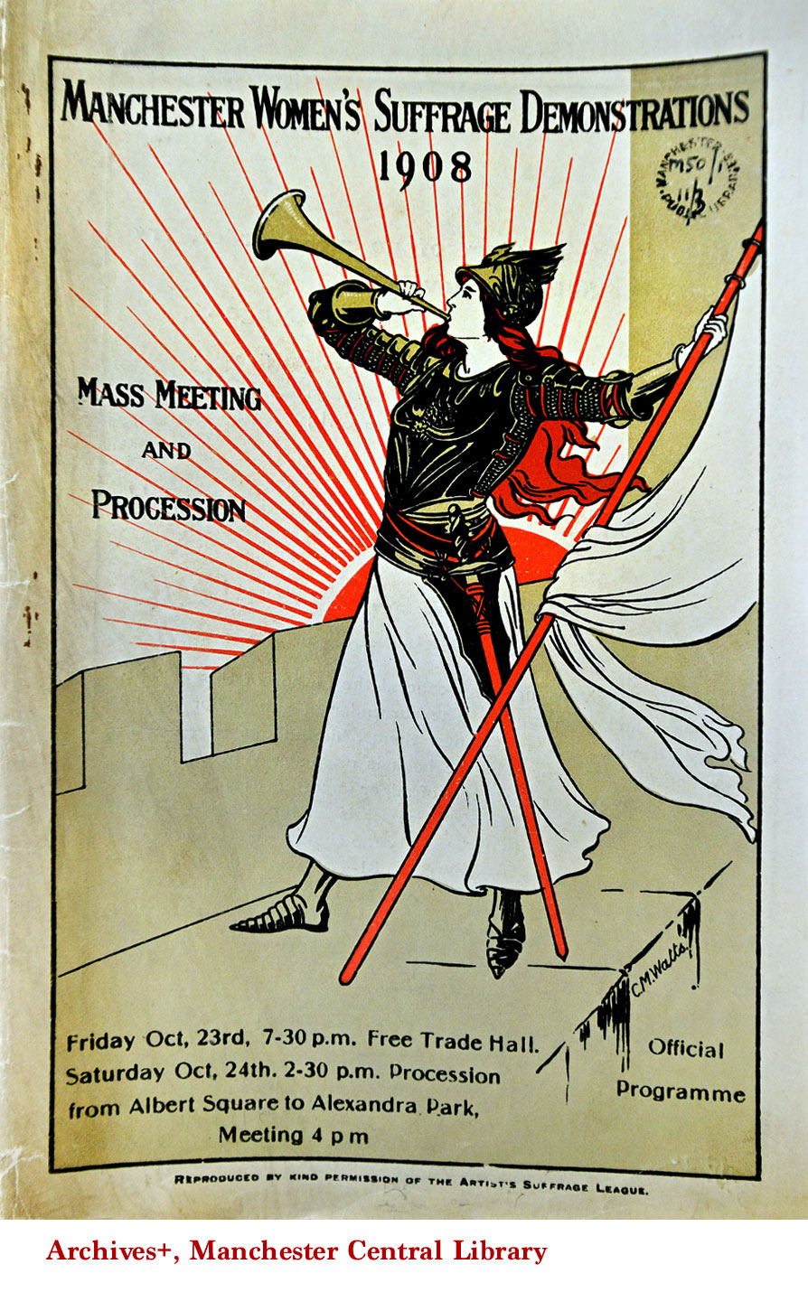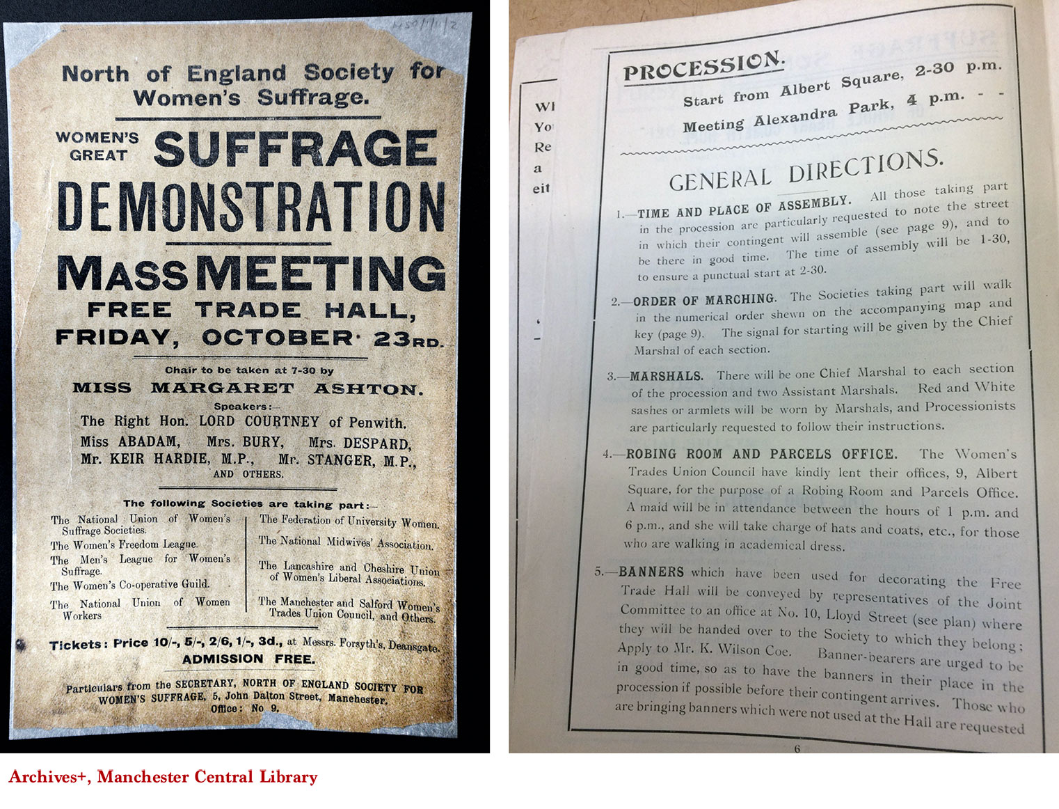 The suffragists organised a mass demonstration in Manchester in 1908 as is evidenced from the poster and procession programme in the suffrage collection of Archives+, Manchester Central Library. The inside of the Programme shows how much planning had gone into the event such as organising marshals and refreshments and how the route would cover central Manchester. The importance of banners and badges is also clear as there are instructions for the banner bearers and where it states, ‘it is hoped that all taking part in the procession will wear a badge’.