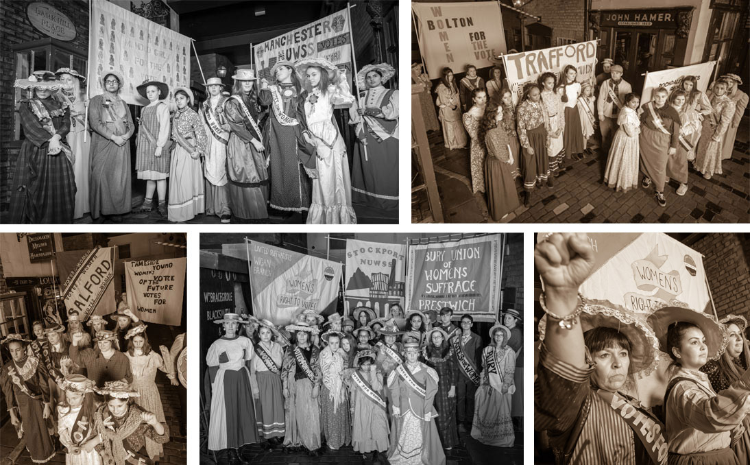 The Greater Manchester Game Changer groups re-enacted this procession at the Victorian replica street, Lark Hill Place at Salford Museum and Art Gallery. They did this wearing period costumes, their replica badges, rosettes and sashes and displaying the banners that they created.