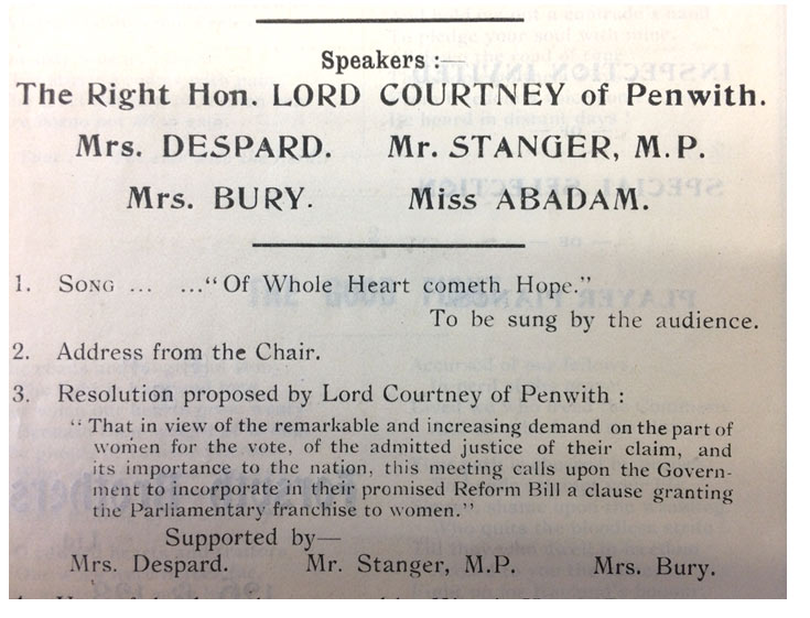 Music, however, was also used at the start of meetings, as can be seen by this extract from a debate agenda where the first item is for everyone present to sing, ‘Of whole Heart Cometh Hope’. The purpose of this singing together was to establish a sense of unity through unifying voices, the words and melody would be rousing and uplifting for the suffragists and (cheekily) intimidate the anti-suffragists who were about to debate them.