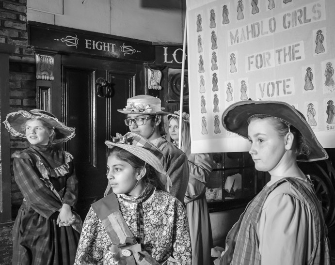 The group recreated the 1908 Manchester Women’s Suffrage Demonstration 1908 by marching down Lark Hill Place (a replica Victorian street at Salford Museum and Art Gallery) in costume wearing their sashes and displaying their banner.